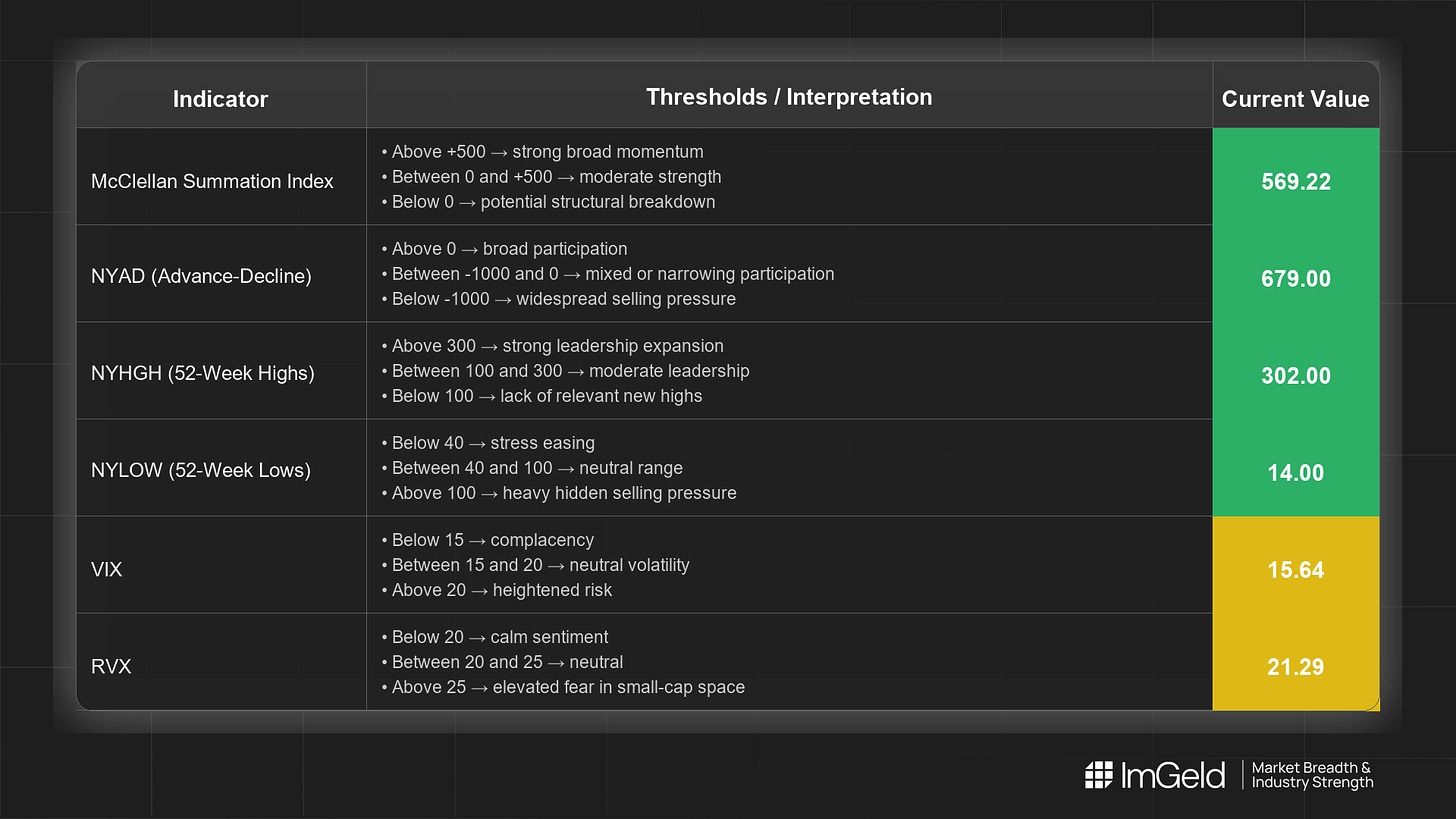 Breadth improved over the last five sessions. NYSI (McClellan Summation Index) advanced and stabilised at elevated levels, NYAD (Advance–Decline Line) turned positive for three straight days, NYHGH (New 52-Week Highs) accelerated, and NYLOW (New 52-Week Lows) compressed. VIX (CBOE Volatility Index) and RVX (Russell Volatility Index) retraced a midweek spike back toward subdued regimes. Tactical bias is tentative, long with strict selectivity. Long opportunities may be emerging within mid-cap industries showing sustained new-high creation and persistent positive A/D. Large-cap short setups remain tactical only, focused on overextended names if breadth stalls and volatility re-expands.