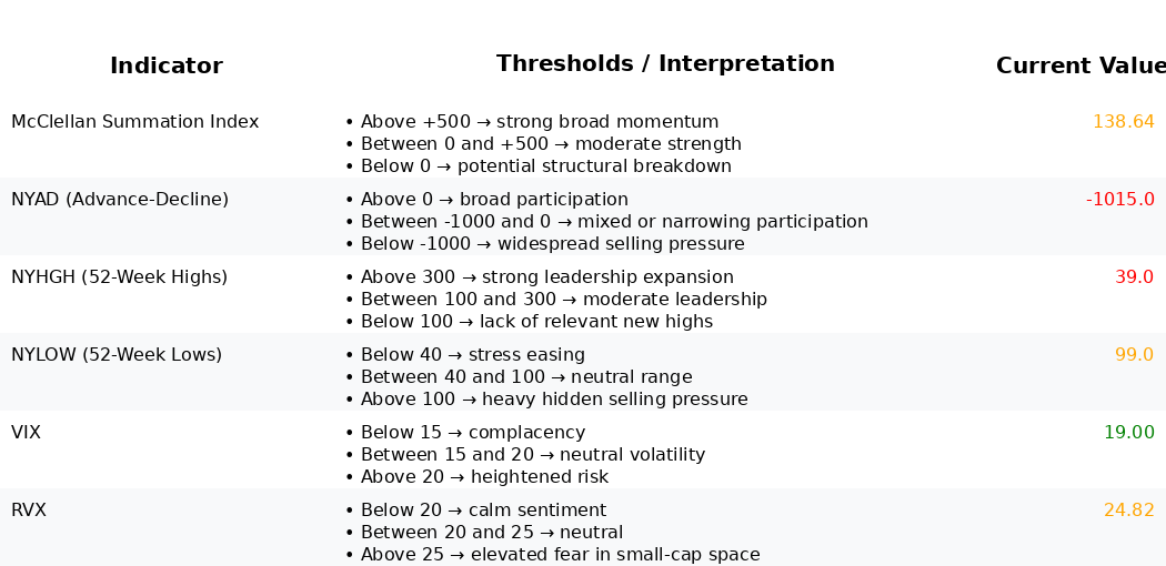 Over a 3–8 week horizon, the base case tilts toward choppy to lower with episodic spikes in volatility unless breadth stabilizes. Confirmation of the current tentative short setup would include: Advance–Decline Line (NYAD) remaining negative, NYLOW sustaining above 100, McClellan Summation Index (NYSI) rolling down toward zero, and CBOE Volatility Index (VIX) closing above 20. Invalidation would require: consecutive positive Advance–Decline Line (NYAD) sessions, McClellan Summation Index (NYSI) turning up and advancing toward or above prior ~200 reads, NYHGH expanding sustainably above 100, NYLOW declining below 40, and CBOE Volatility Index (VIX) slipping back under 17 with CBOE Russell 2000 Volatility Index (RVX) easing below ~23. Until then, keep risk tight, emphasize relative-strength longs in defensives and quality megacaps, and lean into shorts in lagging cyclicals, small caps, and unprofitable growth that are failing at key moving averages.