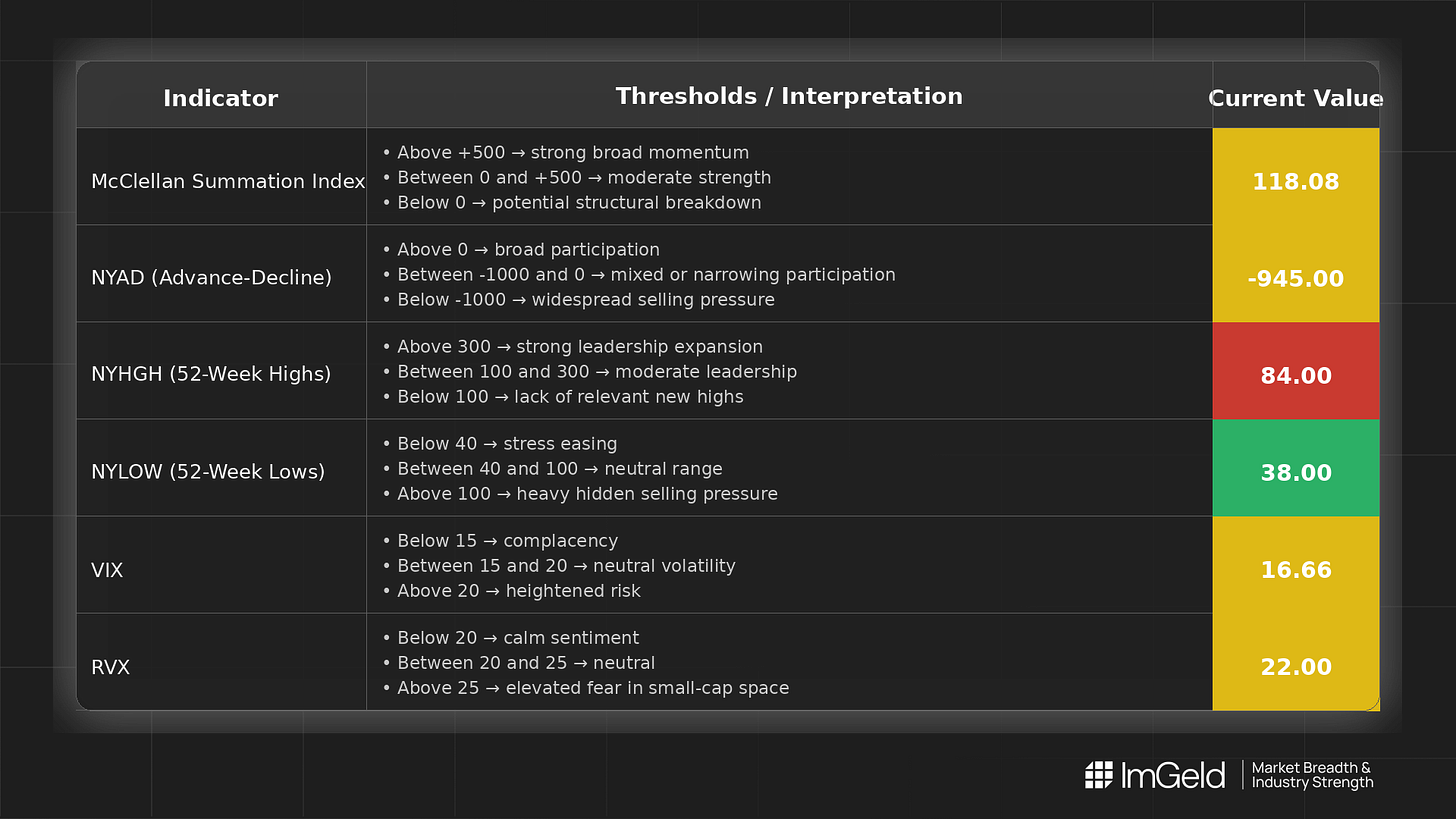 Across the latest week, breadth is mixed: NYSI (McClellan Summation Index) edged higher, while NYAD (Advance–Decline Line) deteriorated sharply. NYHGH (New 52-Week Highs) contracted and NYLOW (New 52-Week Lows) ticked up. Volatility firmed, with VIX (CBOE Volatility Index) and RVX (Russell Volatility Index) both rising. Bias remains neutral with elevated selectivity. Long opportunities may be emerging in resilient mid-cap industries with steady leadership and contained drawdowns. Short setups remain valid in deteriorating large-cap pockets where participation is thinning and volatility is re-pricing.