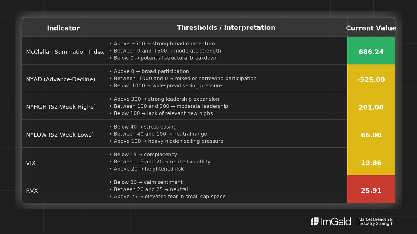NYAD (Advance–Decline Line) Strength early (+839, +438, +600) reversed to broad selling (−704, −525). Participation weakened late week, indicating distribution and reduced follow-through risk for breakouts.