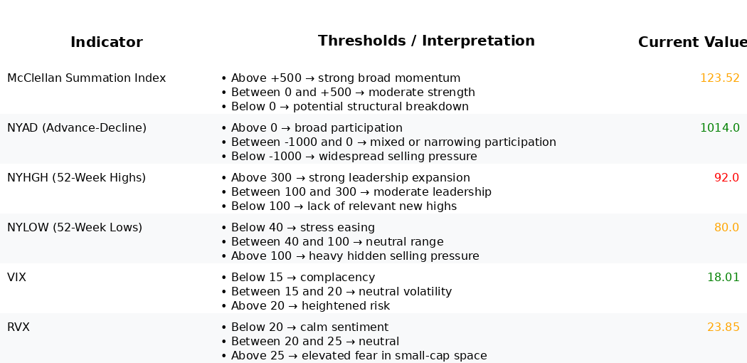 Structural breadth is steady but not expanding. McClellan Summation Index (NYSI) remains above zero at 123.52, which is constructive by threshold, yet two consecutive unchanged readings indicate stalled momentum. NYSE Advance–Decline (NYAD) is likewise static, reinforcing the view of a breadth plateau rather than broadening participation.