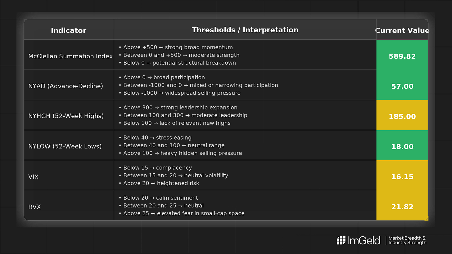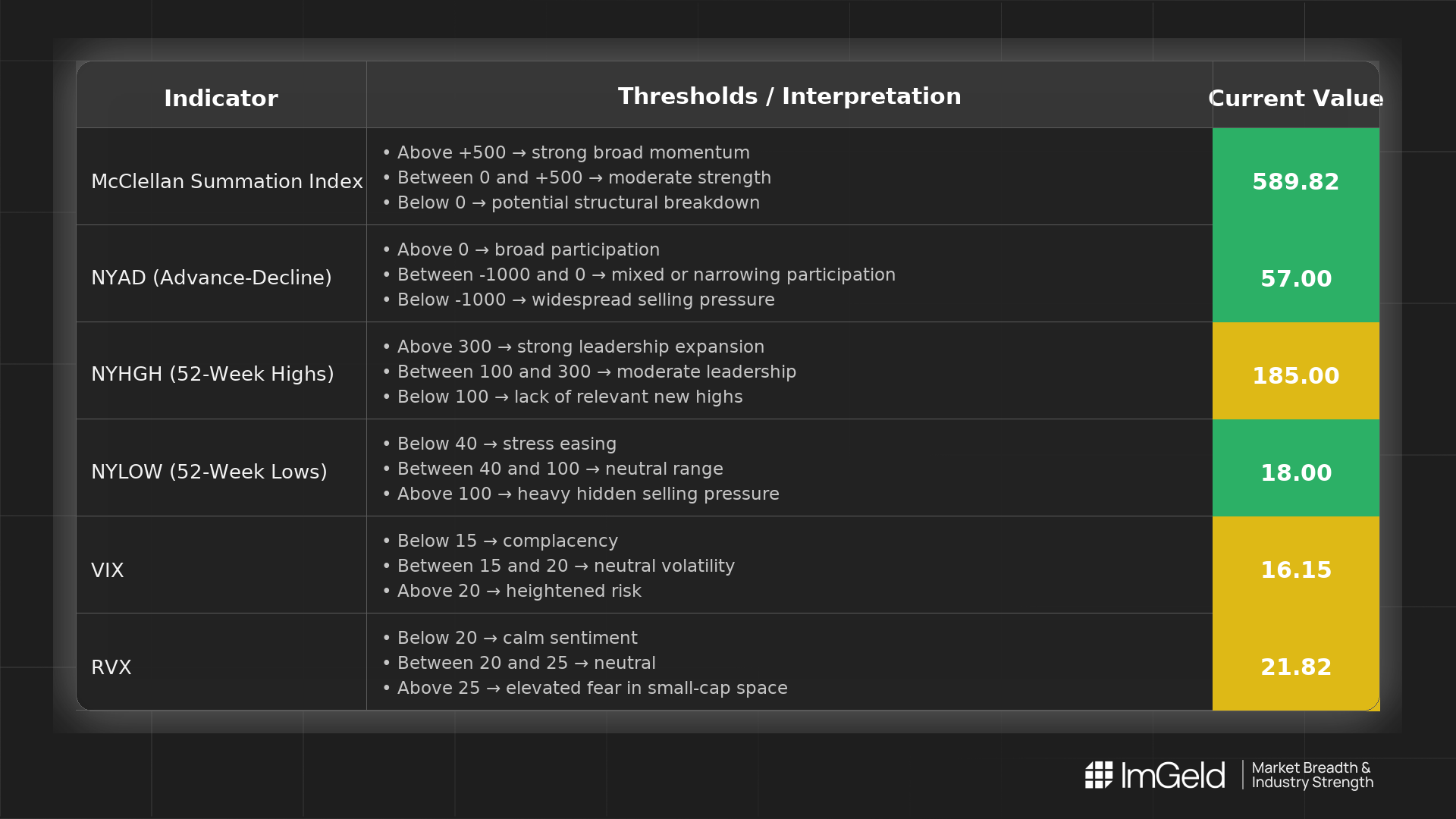 NYSI (McClellan Summation Index) Rising from 516 to 590 over the last three sessions, indicating improving intermediate breadth and constructive internal momentum.