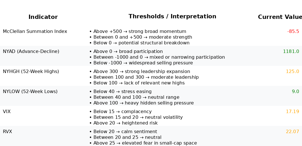 Participation is broadening, evidenced by five consecutive positive NYAD prints and a steady rise in new highs alongside a sharp contraction in new lows. Leadership is rotating from narrow leaders toward a wider set of groups, indicated by the jump in NYHGH and persistent positive daily breadth. Volatility is firmly compressing, improving the risk-reward for trend continuation. A mild divergence persists as NYSI remains negative but is rising, while NYAD is strongly positive; this is typical of early accumulation rather than exhaustion. By the five-day consistency rule: breadth expansion via NYAD is firmly constructive, volatility compression is firmly in place, leadership expansion is firmly improving, while the NYSI turn is tentative pending further follow-through.