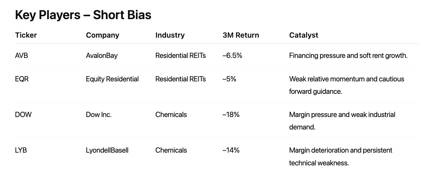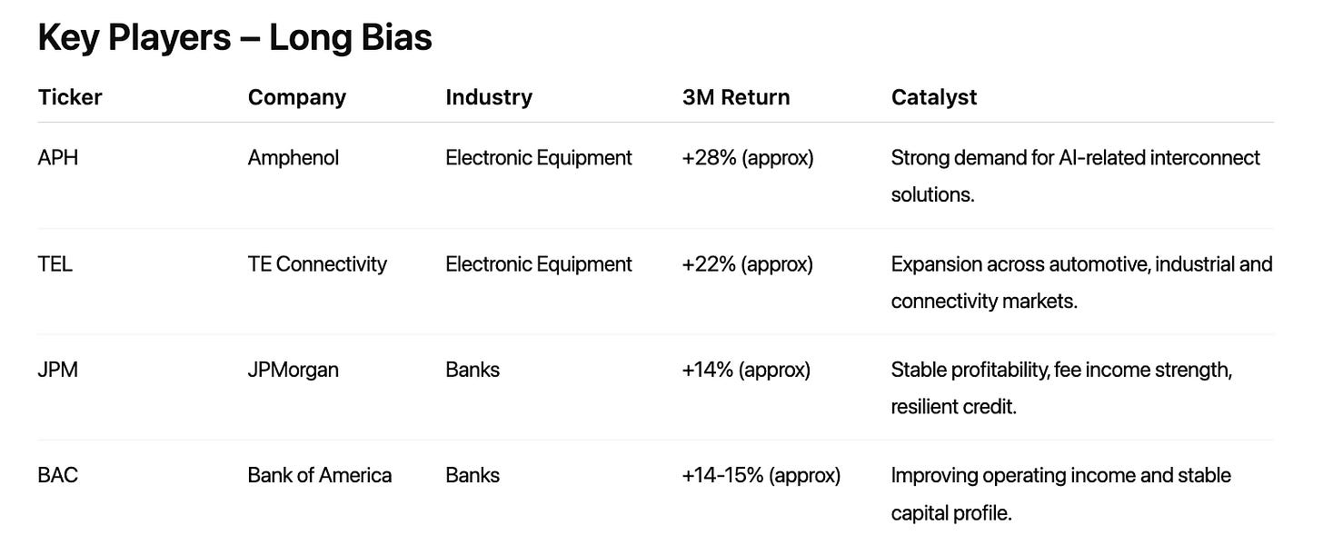 For portfolio construction, opportunity remains concentrated in industries tied to infrastructure, connectivity, and credit resilience. Shorts appear more compelling in sectors exposed to rate pressure or structural demand weakness.