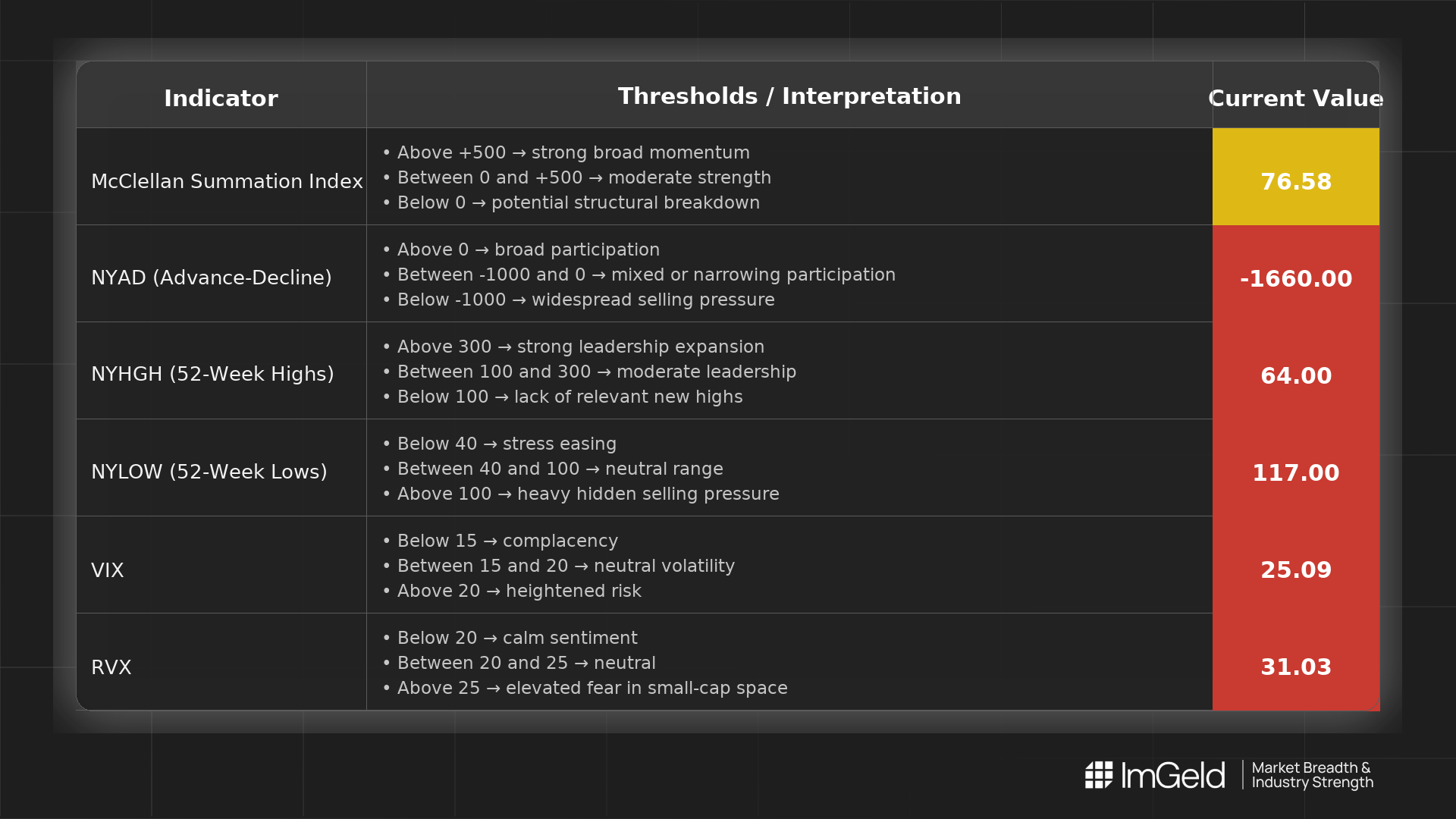 NYSI (McClellan Summation Index) Structure is firmly declining for five consecutive sessions, indicating erosion in intermediate breadth and rising risk of further downside until a base forms.
