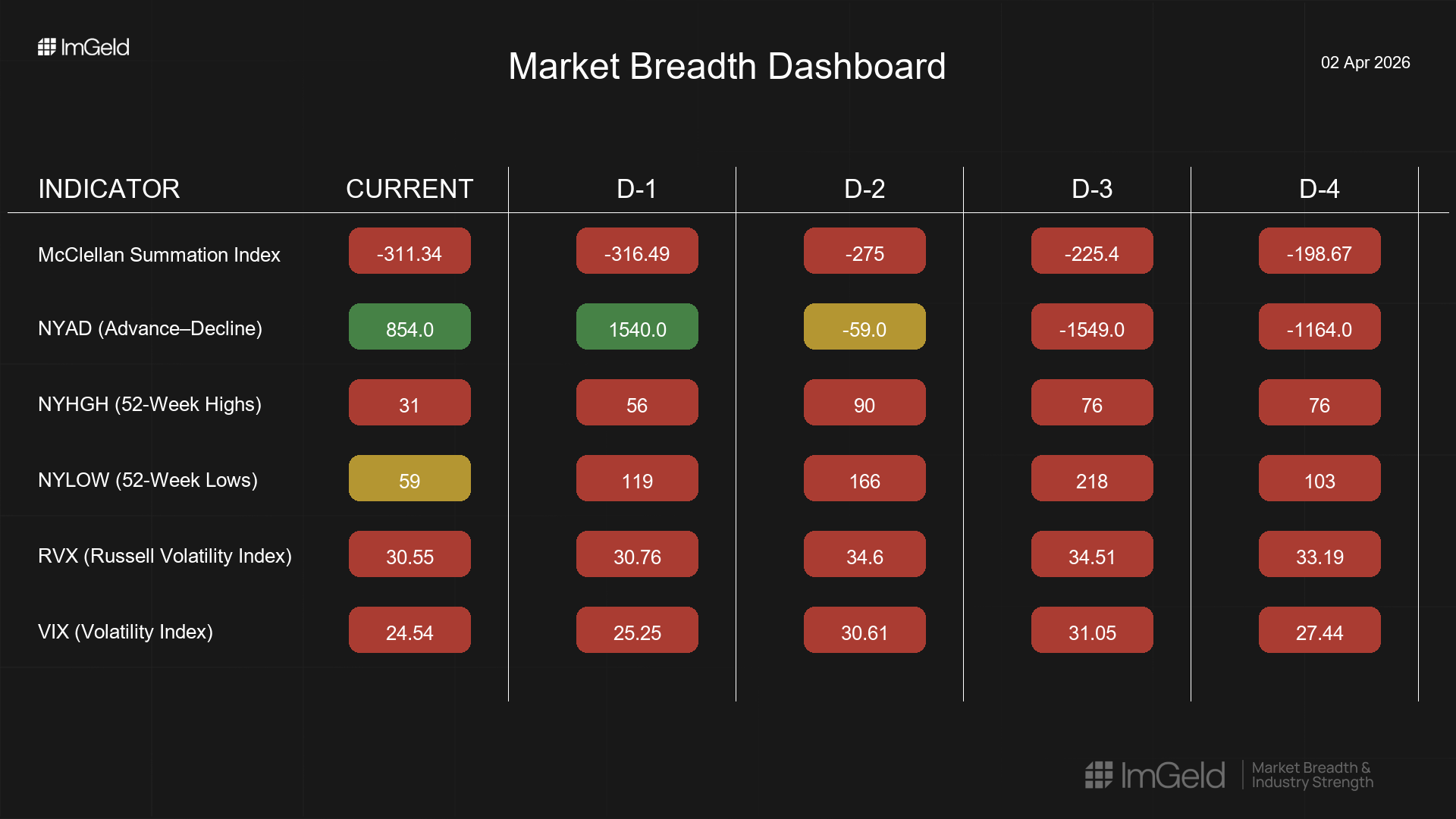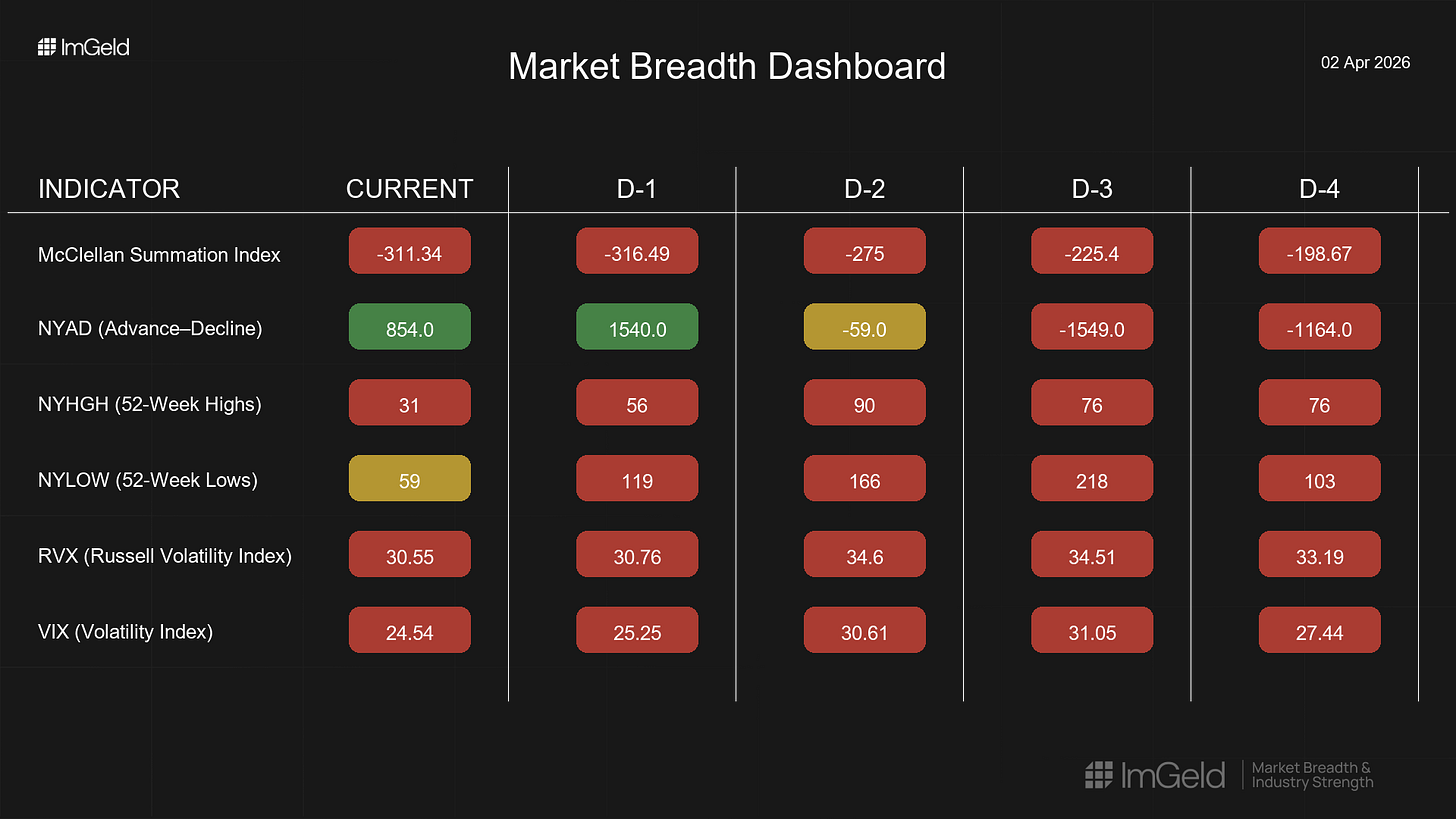NYAD (Advance–Decline Line) Sequence: -1164, -1549, -59, +1540, +854. After heavy distribution, participation strengthened materially over the last two days. Confirmation through continued positive breadth would upgrade the signal.