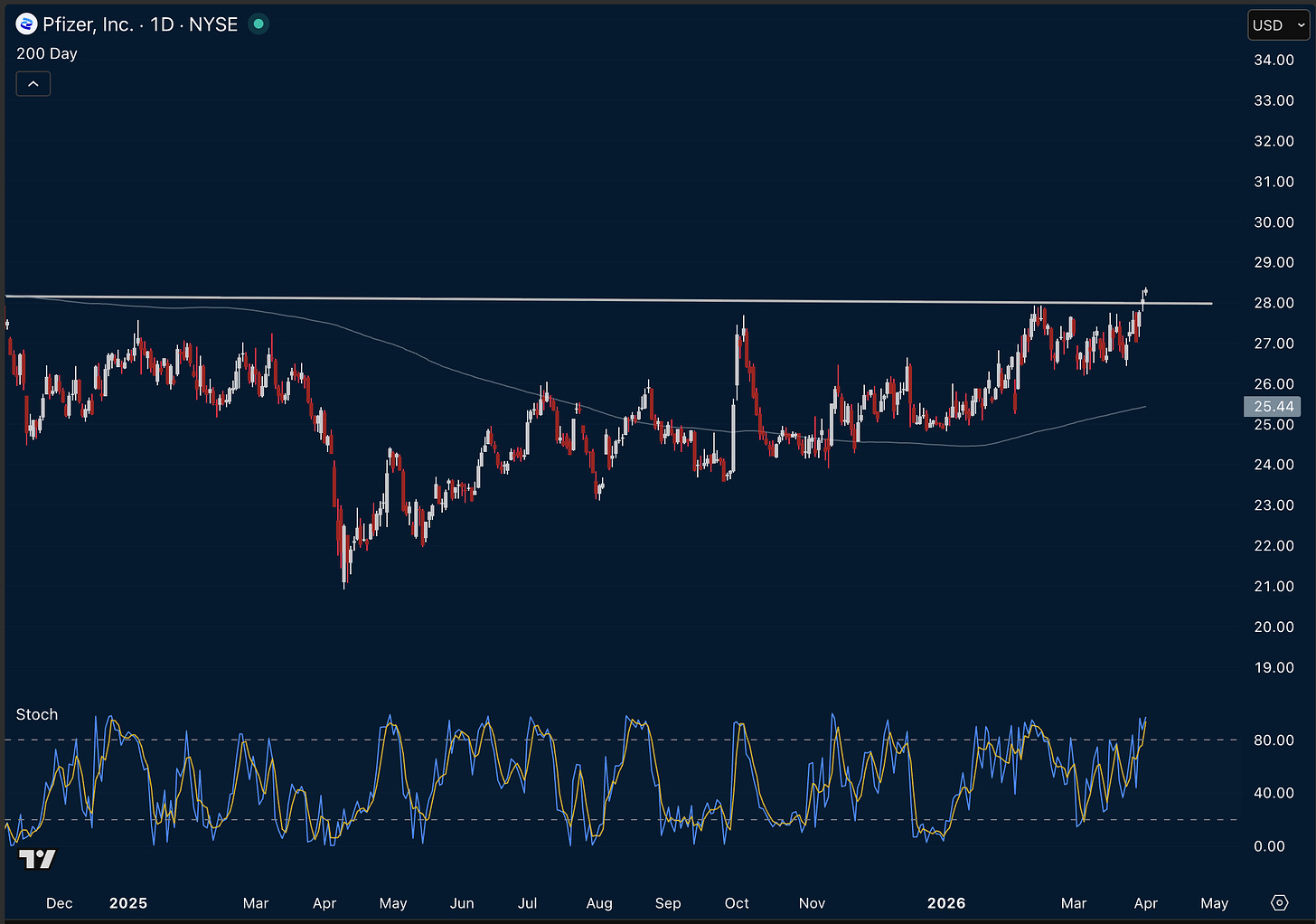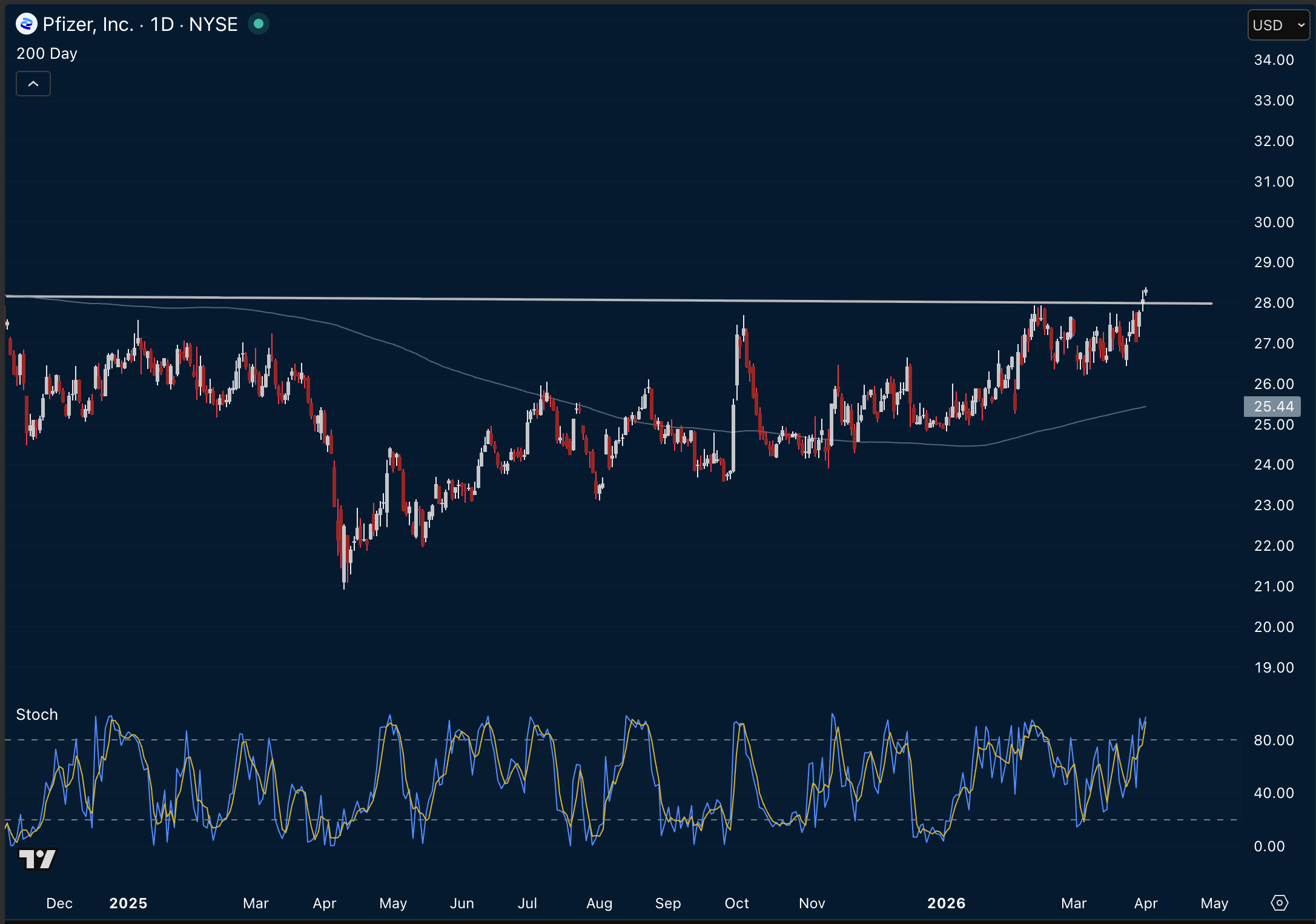 Pfizer has spent four months testing the same ceiling. The $27.50–$28.00 zone has rejected the stock on four separate occasions since November 2025. Each time, the configuration looked similar: price approaching resistance, Stochastic re-entering overbought territory, and the same fundamental backdrop of declining earnings guidance and structural revenue pressure.