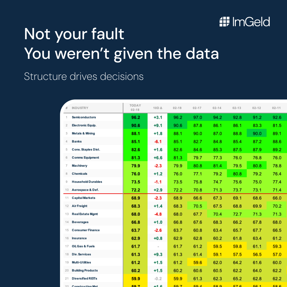 ImGeld is a market structure and portfolio context system designed for disciplined equity traders. It does not generate signals or predictions. Instead, it provides the data, structure, and framing needed to make informed risk and allocation decisions.
