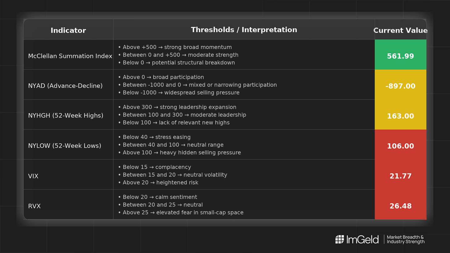 VIX rose from 16.3 to 21.8 and RVX from 22.0 to 26.5 across five sessions. The rising-vol regime favors tighter risk controls, quicker profit-taking, and maintaining hedges. Elevated RVX relative to VIX underscores higher small- and mid-cap sensitivity to shocks despite selective long setups.