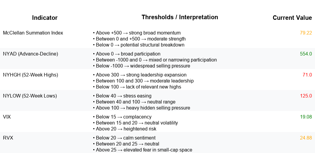 3–8 week outlook: Neutral with downside risk if stress persists. Confirmation for an improved setup would include NYSI stabilizing and turning higher while staying above zero, a sustained positive NYAD run, NYLOW falling and holding below 40, and VIX drifting sub-17 with RVX compressing. Invalidation would be NYSI rolling below zero, NYLOW remaining above 100 for multiple sessions, and volatility sustaining above 20–22, which would shift bias toward Tentative Short.
