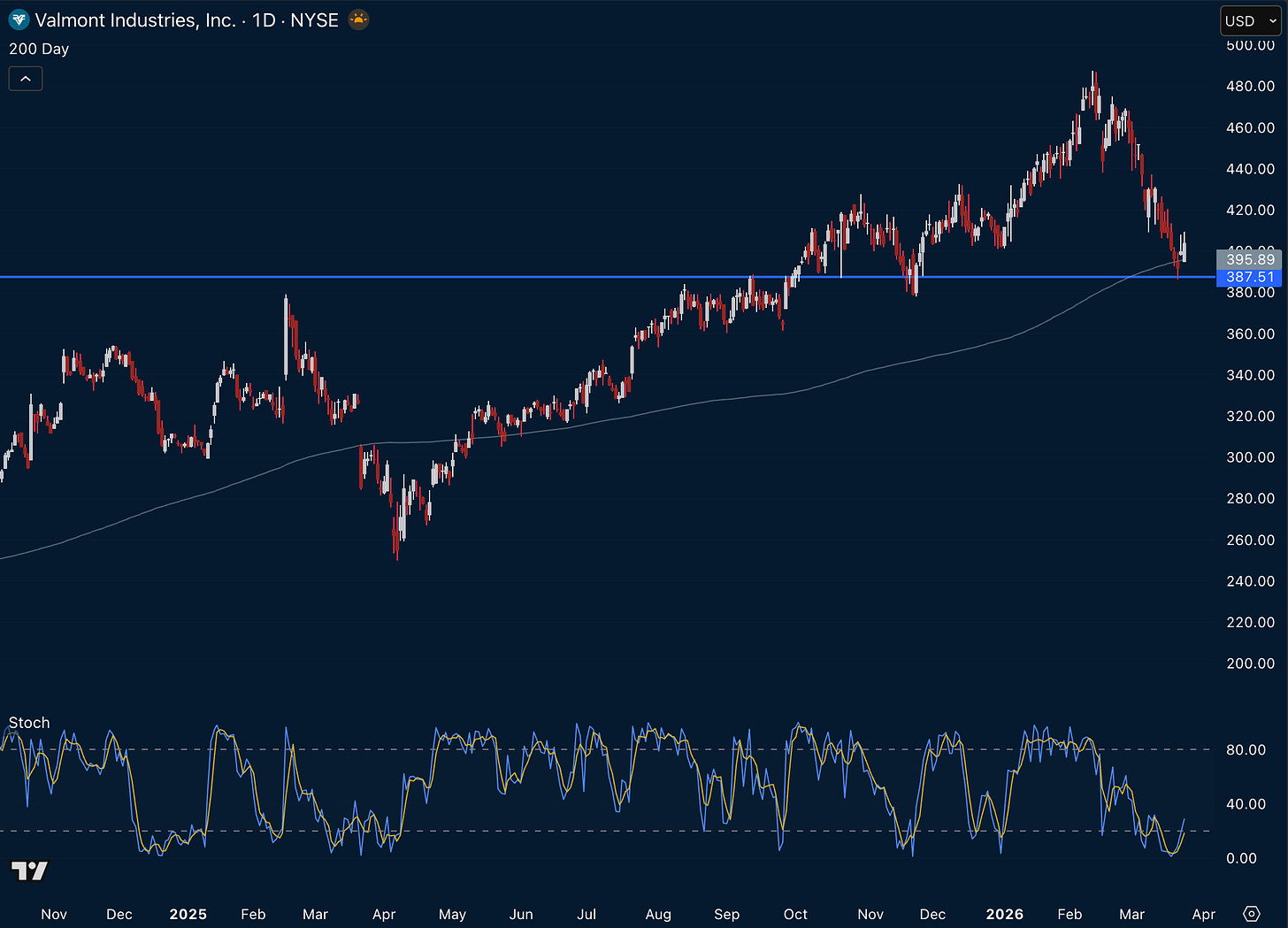 Valmont Industries hit the 200-day moving average today at $391.96. Stochastic at 9.7 — deeply oversold territory.